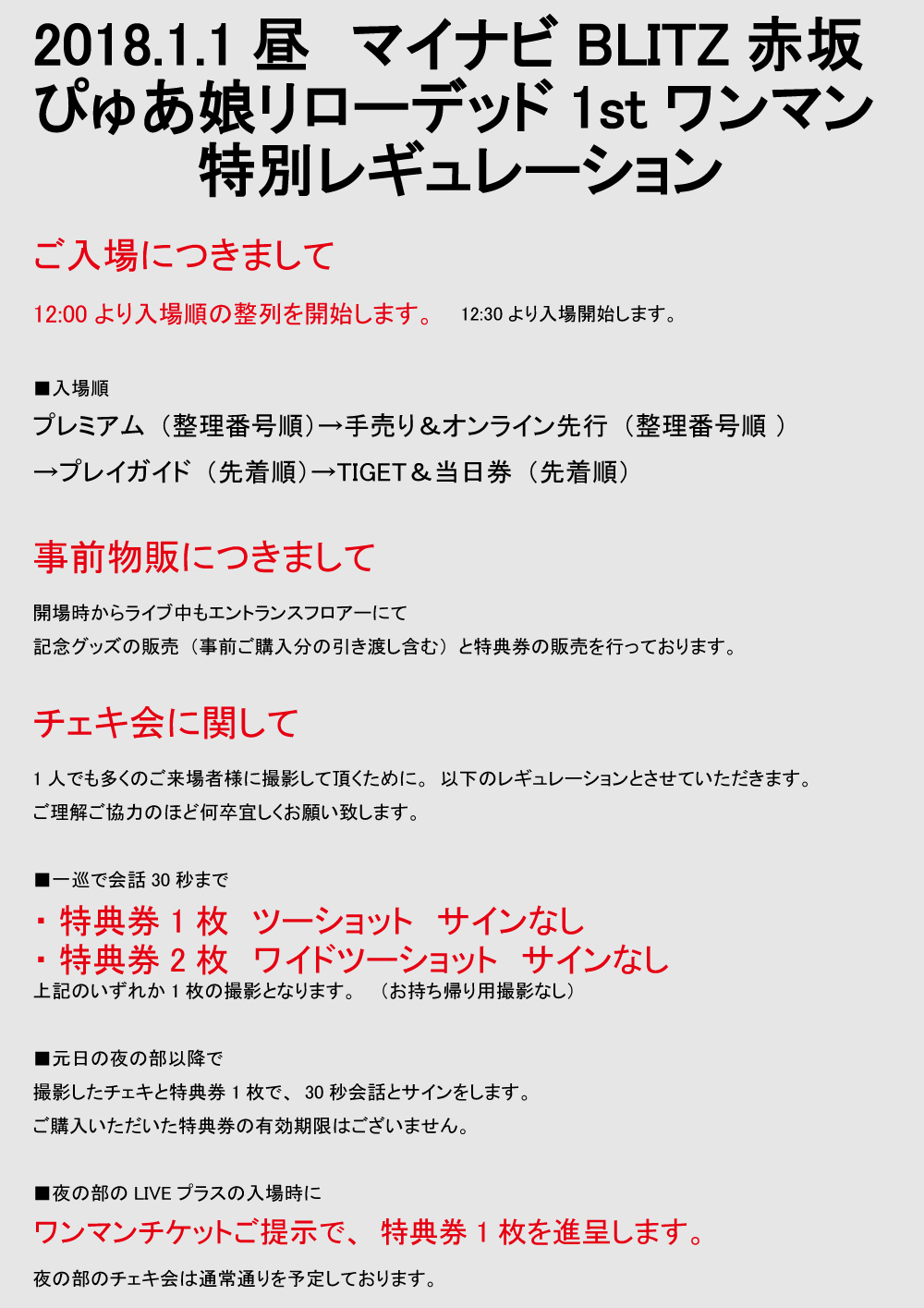 そのような行為によりケガ・事故等発生した場合は当事者同士で協議を頂き、主催者は関与致しかねます。 - 当日お昼にBLITZワンマン開催のぴゅあ娘リローデッドの出演も決定!