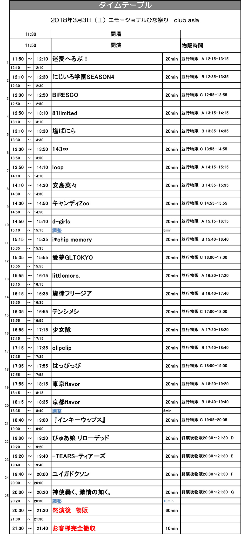 時間:開場11:30 開演11:50 物販終了21:30 完全撤収21:40