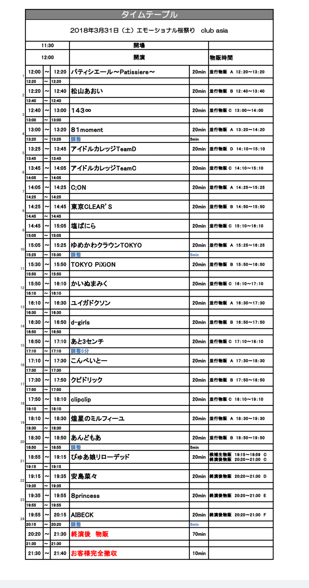 あんどもあ / C:ON / あと3センチ / AIBECK / TOKYO PiXiON / アイドルカレッジTeamC / アイドルカレッジTeamD / かいぬまみく 主催なので ぴゅあ娘リローデッドも 候補生も かいぬまみくも出演します。