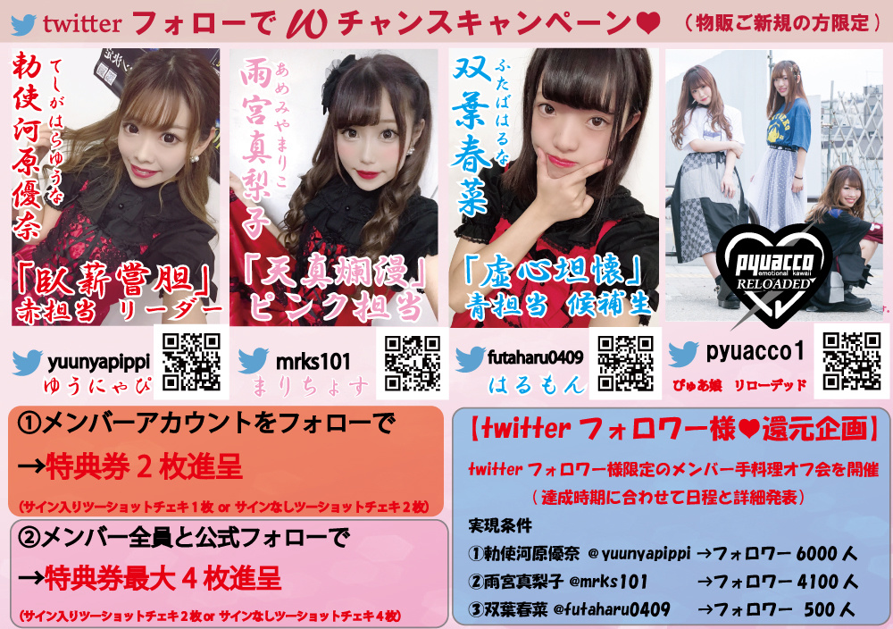 ※物販の最初に全員無料握手会を行います♥ ※出演メンバー 勅使河原優奈(ゆうにゃぴ、リーダー、赤担当) 雨宮真梨子(まりちょす、ピンク担当) 双葉春菜(候補生、青担当) スタンプカードのご予約は、 ぴゅあ娘リローデッドTwitter @pyuacco1 に 日付、お名前、人数をDMお願いいたします。 (11/24 11:30締切)